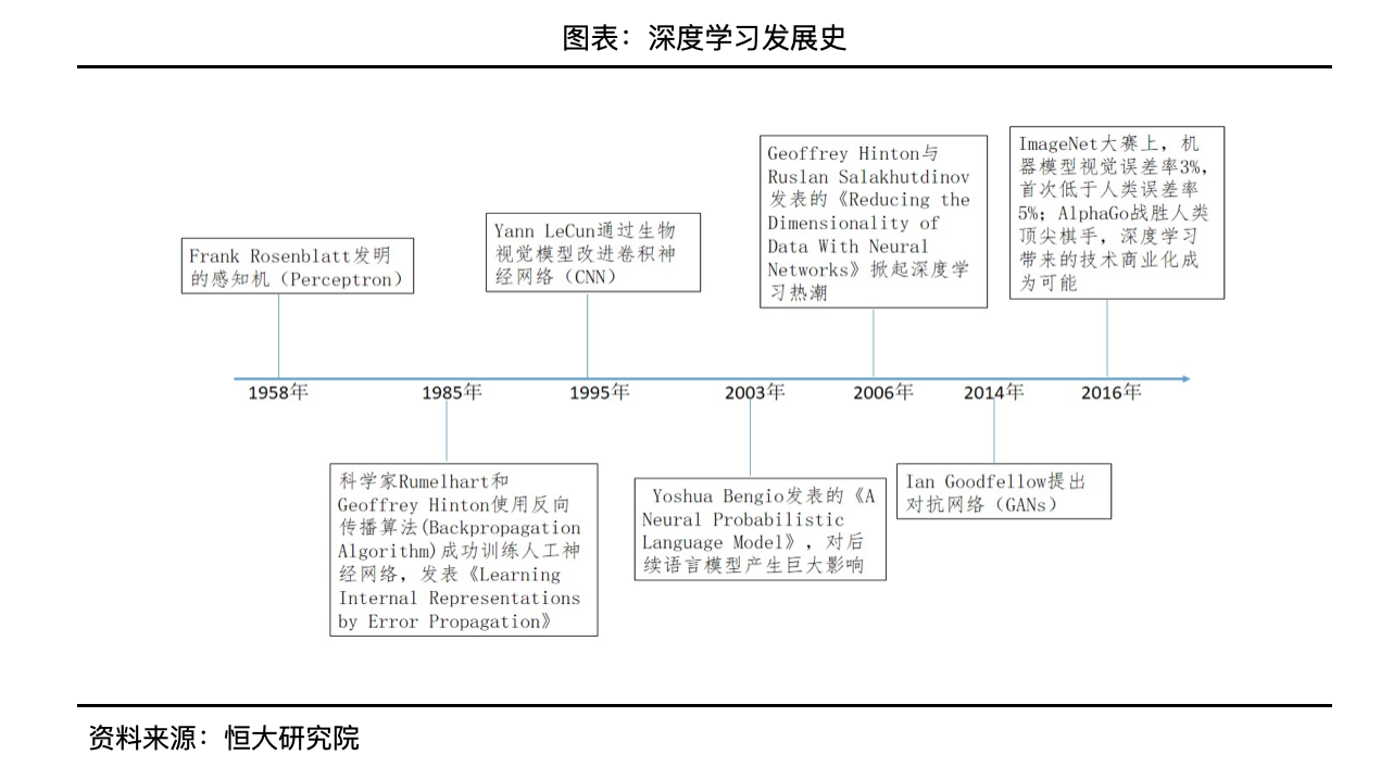 足够多、足够好的数据支撑人工智能“感知”阶段,而人工智能算法使计算机拥有思维,从而达到“理解、决策”,深度学习在这过程作出巨大贡献。深度学习是一类模式分析方法的统称,计算机通过学习样本数据来掌握内在逻辑和规律,从而拥有分析能力,这项研究最早可以追溯到1958年弗兰克·罗森布拉特发明的感知机(Perceptron)。利用感知机,可以进行图像区分训练,例如最常见的从水果堆中选出“苹果”或者“香蕉”。然而当时缺少足量的数据,该项研究陷入瓶颈,并出现过度拟合(Overfitting)问题,例如学生希望通过练习相似的题目来掌握一种题型,但是训练量不够大、并没有理解题型背后的知识点,考试一旦发生些许变化便无法解出答案。后来,科学家通过研究人脑,试图模仿人脑神经网络机制来进行图像、声音等分类工作,逐渐演化成如今的深度学习。