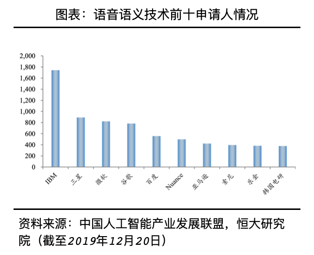 语音语义技术主要是让计算机学会“听、读”文字、段落、文章等,经常用于文字识别、语音情感分析、人机对话、声音定位等,适用于翻译软件、车载操作系统、智能音箱、语音助手等领域。从语音语义技术相关的技术申请情况来看,截至2019年12月20日,全球共申请4.3万项专利族,中美两国依然是这个领域的主要申请国,合计占比超过75%。从申请人来看,语音语义领域的申请人以企业为主,其中IBM、三星、微软为前三申请人,申请专利量分别为1741项、890项、821项。从专利授权人来看,微软、IBM、Nuance为前三授权人,授权量分别为672项、468项、440项。从国内企业情况来看,百度成为唯一一家在语音语义技术领域申请量和授权量均列全球前十的企业。