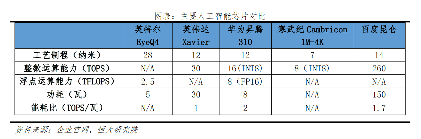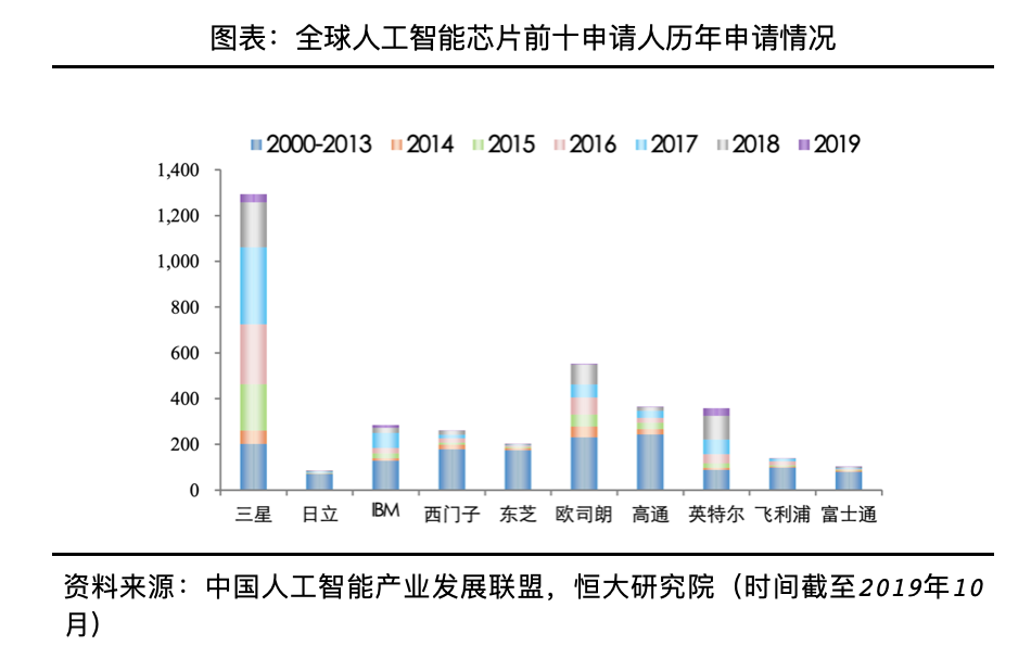 人工智能芯片的出现显著提高数据处理速度,支撑日益复杂的算法处理庞杂数据,是人工智能发展的重要基础。随着处理的数据量增多、从通用场景到各类特定场景,算法模型设计的框架和层数也越来越复杂,这对基础硬件提出更高的运算要求。从相关专利申请情况来看,中美两国是申请大国,截至2019年10月,中美两国人工智能芯片专利申请量分别为1.6万项和1.1万项。从相关申请人来看,传统芯片和半导体企业更有优势,其中三星、日立和IBM是该领域的前三专利申请人,从近年申请趋势来看,三星和英特尔表现更积极。从实际应用产品来看,目前具备代表性包括英特尔EyeQ系列、英伟达Xavier系列、华为昇腾310、寒武纪Cambricon 1M系列、百度昆仑芯片等。