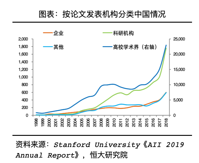 从论文发表机构类型来看,包括中国、美国、欧盟27国等在内的各国和地区均以高校为核心科研力量,2018年三者高校论文产出占各自总产出的92.1%、84.6%、90.7%。除高校外,中美两国的主力科研主体有所不同,2018年中国科研机构产出约为中国企业产出的3倍,而同期美国企业产出约为美国科研机构产出的1.6倍。