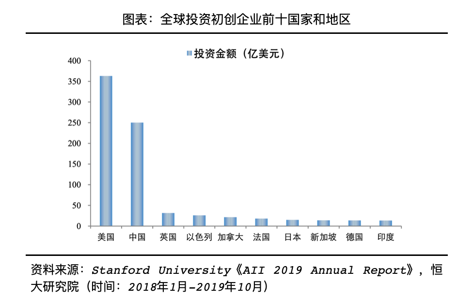 从国家和地区来看,美国公司和中国公司是全球投资重点。由于美国的技术领先性,美国无论是被投资金额还是被投资企业数量均保持世界第一。尽管中国被投企业数量不及美国,由于每笔投资金额较高,例如旷视科技2018年3月C轮融资4.6亿美元、商汤科技2018年4月C轮融资6.2亿美元,中国初创企业被投资金额仅次美国、约250亿美元。此外,英国、以色列、加拿大、法国、日本、新加坡、德国和印度是被关注较为频繁的国家和地区。