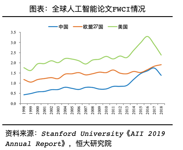 中国人工智能领域论文数量增长较快,但论文质量与美国依然存在差距。全球累计共发布人工智能论文超70万篇,中国、美国是论文发表大国,2018年中美两国分别发布论文2.5万篇和1.6万篇,全球合计占比46.5%。从增长趋势来看,美国保持匀速增长,中国自2014年后增长较快,中国论文数量占全球总量比重从1998年的8.9%上升为2018年的28.2%。从代表论文质量的FWCI指数(平均加权引用影响指数)来看,中国论文质量也在稳步提升,从1998年的0.43提升至2018年的1.39。美国保持全球最高水平,长年保持在2左右,2018年FWCI指数达2.38。