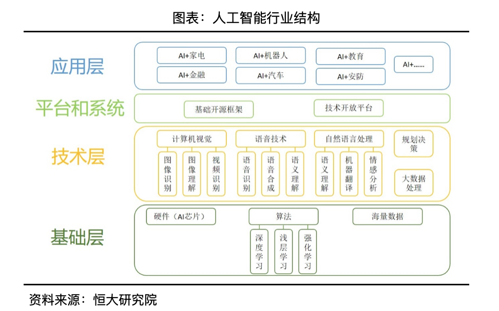 人工智能是第四次工业革命的重要组成部分,将推动数字经济产业转型升级。自18世纪以来,人类社会共发生过三次大型的技术革命,分别是蒸汽机革命、电力革命和信息互联网革命。每一次的技术革命均伴随着相关学科的发展,理论知识又在实际运用中得到完善,“技术突破-知识学科进步”形成良性循环,并且成为后续其他的技术发展的支撑,对社会的影响力也将随之增强。得益于互联网信息时代的数据积累,半导体行业设计、制程进步和芯片运算能力提升,深度学习结合强化学习带来的计算机视觉、语音技术、自然语言处理技术应用更精准,人工智能将是第四次技术革命中的重要技术,如同人工智能和机器学习领域国际权威学者吴恩达所说,“人工智能是新电能,正改变医疗、交通、娱乐、制造业等主要行业,丰富充实着无数人的生活”。