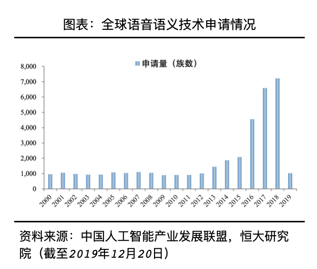 深度学习的发展推动人工智能基础应用技术突破,自2010年起,全球包括计算机视觉、语音语义等基础应用技术的专利申请量急速增长。