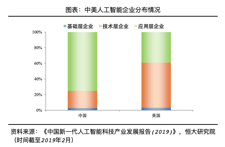 中美两国是全球人工智能企业聚集地,中国企业集中于应用层,美国企业集中于技术层。截至2019年2月,全球共有人工智能企业3438家,美国以1446家位列第一,全球占比42.1%,中国第二、共745家、全球占比21.7%。从企业类型来看,中国主要为应用层企业,美国主要为技术层企业。中国应用层人工智能企业占比最高,为75.2%;技术层居第二位,占比为22%;基础层企业占比最少仅为2.8%。而美国更重视技术研发,三类企业占比分别为39.1%、57.7%、3.2%。