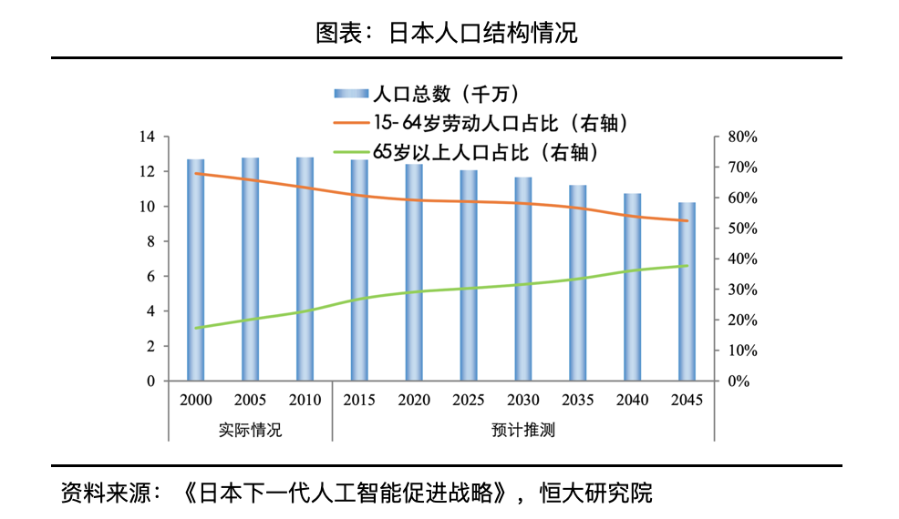 日本由于面临严峻的少子化老龄化问题,着重研究人工智能在机器人、医疗、汽车交通等领域的应用。日本生育率长期低迷、老龄化水平长期位居世界第一,1992年日本劳动年龄人口占比见顶,2008年日本人口总量见顶,这对日本经济、社会发展产生了深远的负面影响,包括养老、健康等挑战。以2016年发布的《日本下一代人工智能促进战略》为起点,日本不断推出相关政策规划,围绕“基础研究-应用研究-产业化”三个方面,其中日本总务省下设的信息通信技术研究所和文部科学省进行人工智能理论和技术研发,经产省解决应用场景问题,经产省建立的人工智能研究中心(AIRC)促进产学研合作,主要承担成果转化和推广。