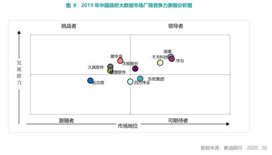 因而在政务云市场与涉及应用和服务的大数据市场的参与者有所差异,在大数据市场,浪潮、华为、千方科技为市场领导者。可以预见,全球服务器与云计算巨头浪潮与全球ICT巨头华为之间在政务云、大数据市场竞争将会更加激烈。