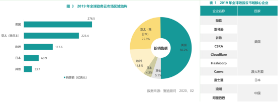 据赛迪顾问的报告显示,2019年全球政务云市场规模达到478.9亿美元,增速达13%,其中美国由于拥有微软、亚马逊、谷歌、CSRA、Cloudflare、Hashicorp等核心企业占据全球政务云市场的50.2%的市场份额;并且按销售额算,全球政务云市场市场产品结构分布也相对均衡,其中IaaS占据41.7%、PaaS占据15%、SaaS占据43.3%。
