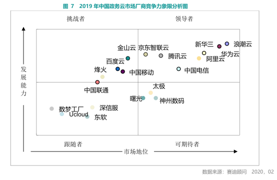 应该明确的是,帮助政府(组织)进行数字化升级,实际上是云服务巨头的to G市场,经过三年高速增长,国内政务云市场主要搭建者分别是浪潮云、华为云、阿里云、新华三属于市场领导者,阿里云、中国电信、腾讯云、京东智联云等紧随领导厂商。