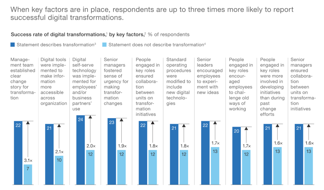 麦肯锡报告 Unlocking success in digital transformations (文末可下载)指出,在他们之前的调查中,2016企业数字化转型成功率仅为20%;2014年,这个数字为26%;2012年仅为20%。何为成功的转型?根据受访者的说法,系指在改善绩效和使组织随着时间的推移持续改进方面非常或完全成功的转型。
