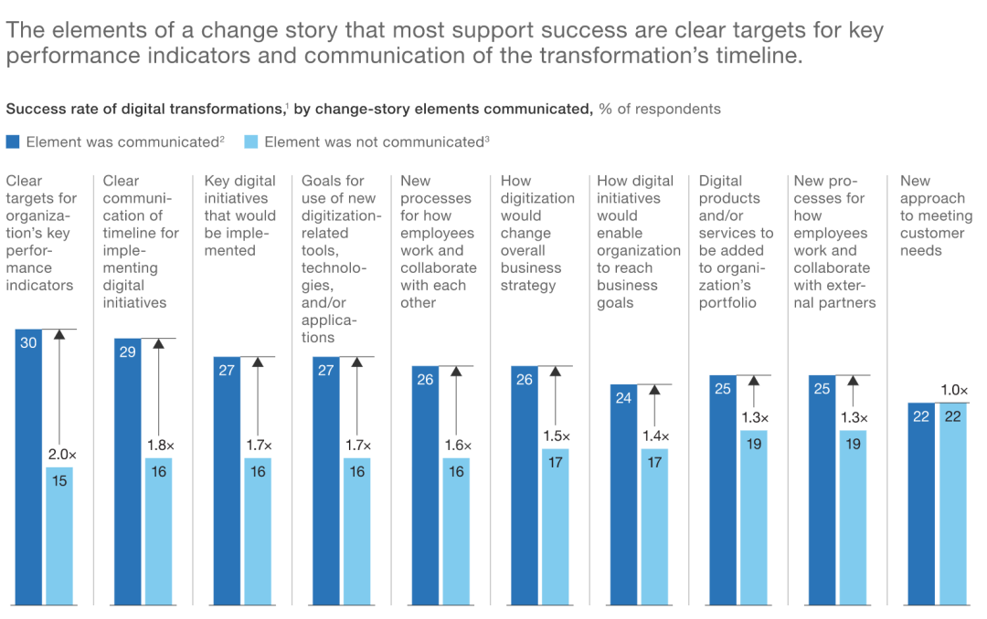 正如我们在传统变革工作中所看到的那样,在数字化转型期间,清晰的沟通至关重要。更具体地说,成功的关键是传达变革故事,它可以帮助员工了解组织的发展方向,组织为何变化以及变化为何重要。在遵循这种做法的组织中,成功进行转型的可能性是三倍以上。