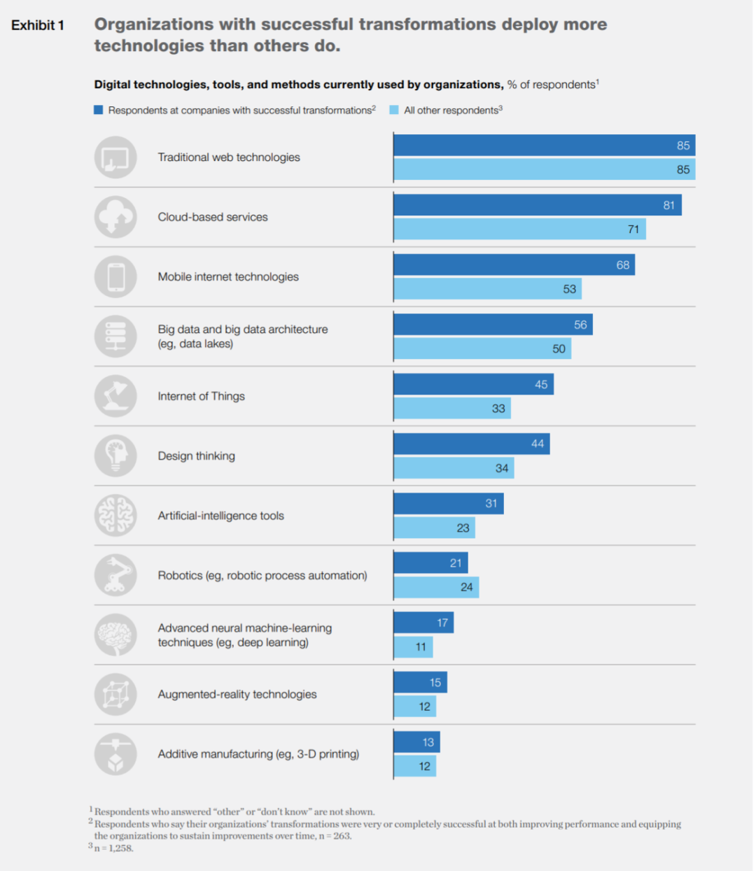 对比其他组织,转型成功的组织部署了更多的技术。来自麦肯锡报告 Unlocking success in digital transformations 。