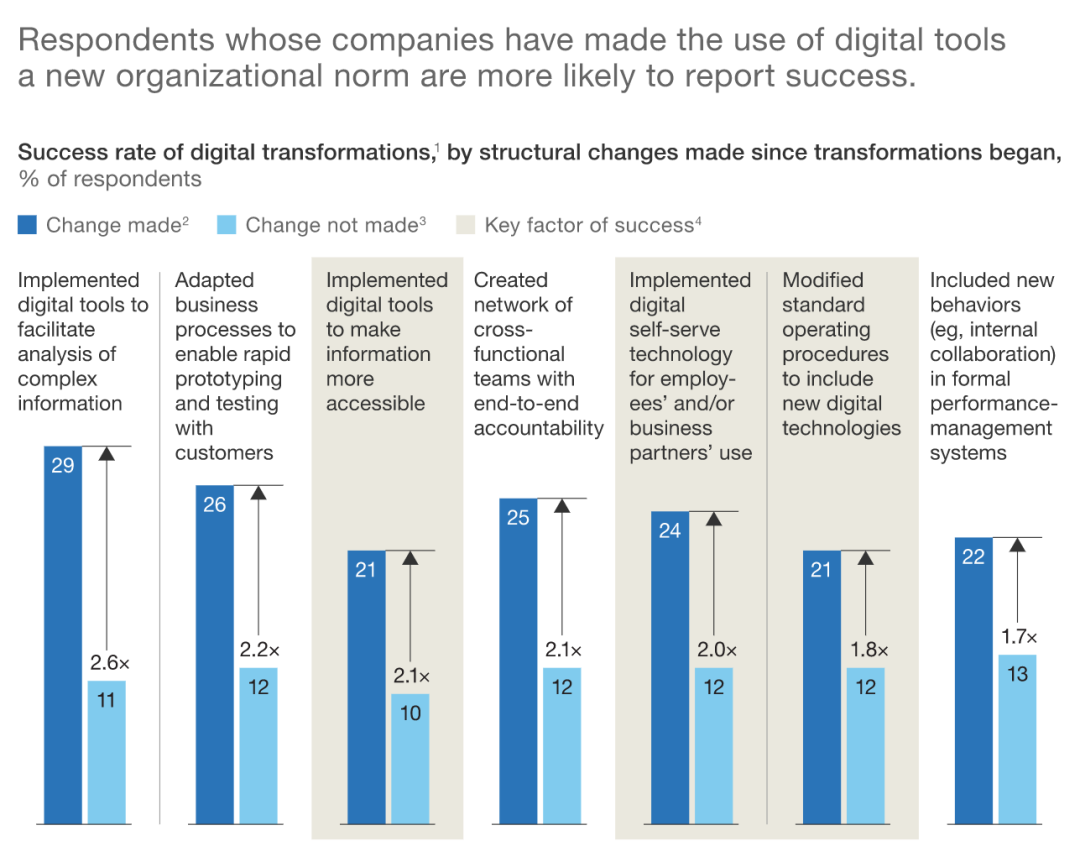 为了让企业赋予员工新的工作方式,麦肯锡调查了数字化工具和流程能在多大程度上帮助转型成功。如下表所示:他们向受访者询问了自转型以来其企业做的7个结构变革,其中3个变革都涉及将数字工具作为新的组织规范的使用。